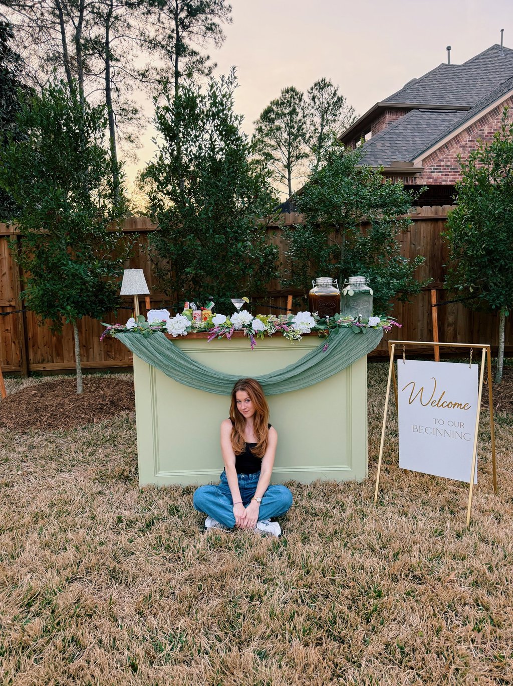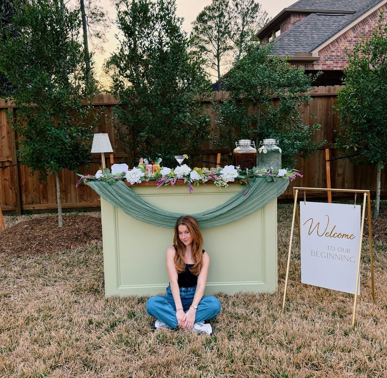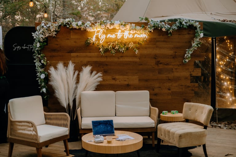 A large wooden backdrop that also serves as a Photo Booth. It comes with a lounge set and neon sign as well as decorative faux greenery and florals.